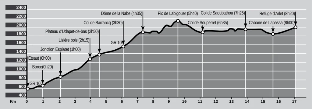 Cruzar a Borce y seguir las marcas de GR10 hasta el Col de Barrancq. Seguir por la cresta en sentido ascendente hacia Saoubathou. El camino pasa por el Col de Labigouer y Souperret. Desde el Col de Saoubathou , ya casi en el frontera, tomar dirección Arlet.
